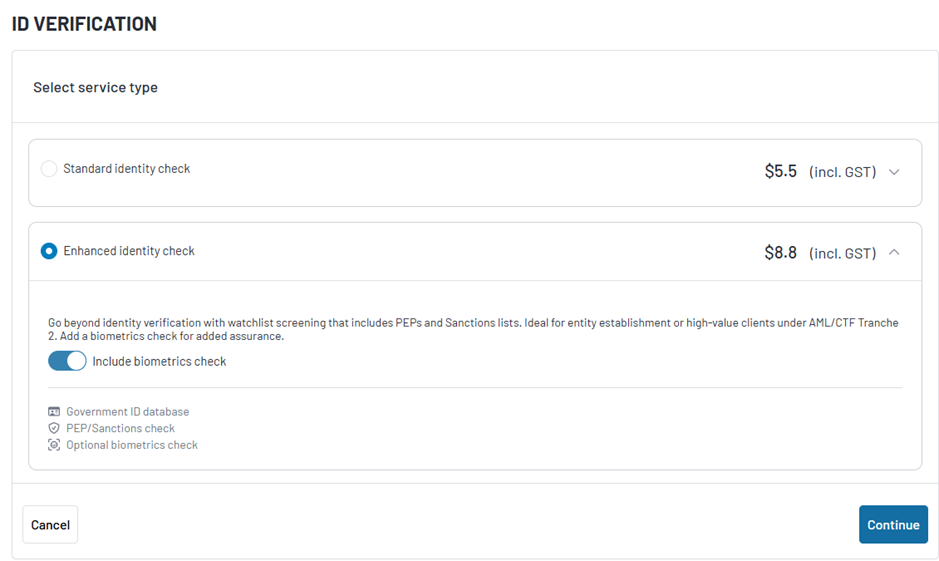 There are 3 service types, and each service type includes an optional Biometric check.