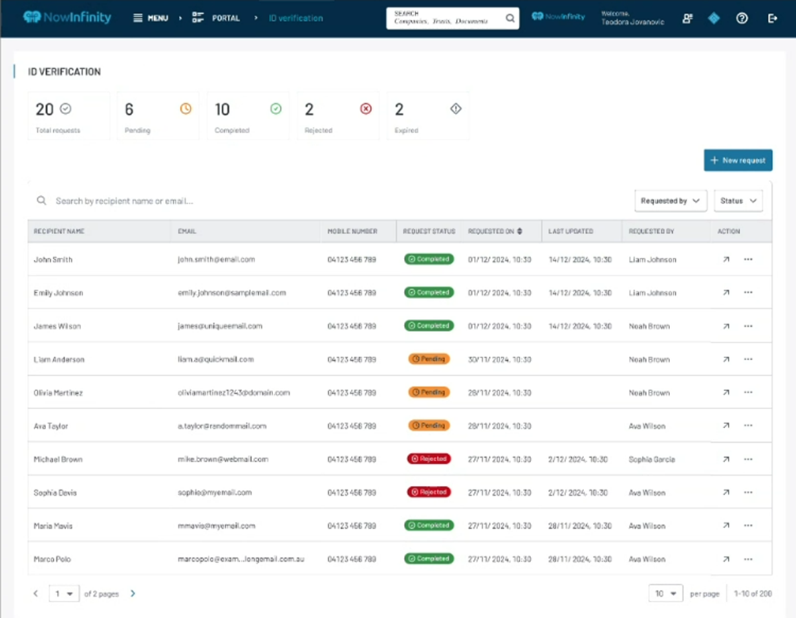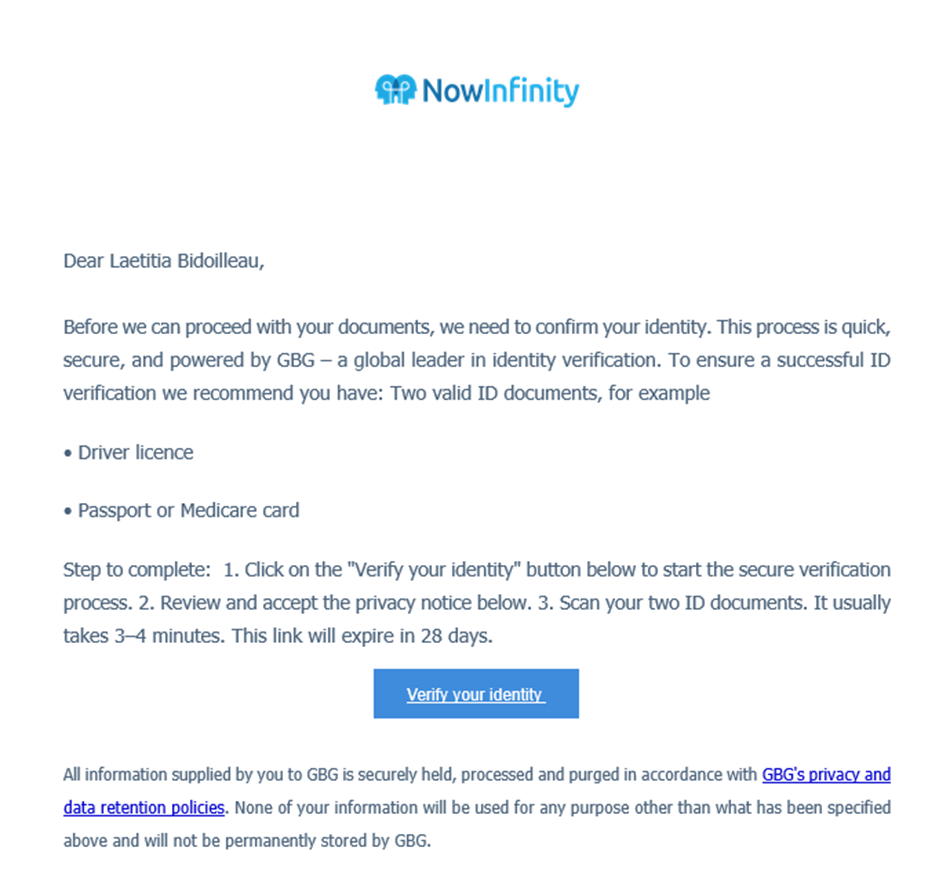 ID&V helps you meet AML/CTF customer due diligence requirements by enabling identity checks to be initiated from NowInfinity and completed securely by the individual.